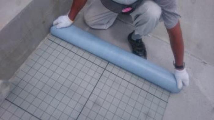 樹脂モルタルの施工後通気用のシートを床面全面に敷き込みます。
